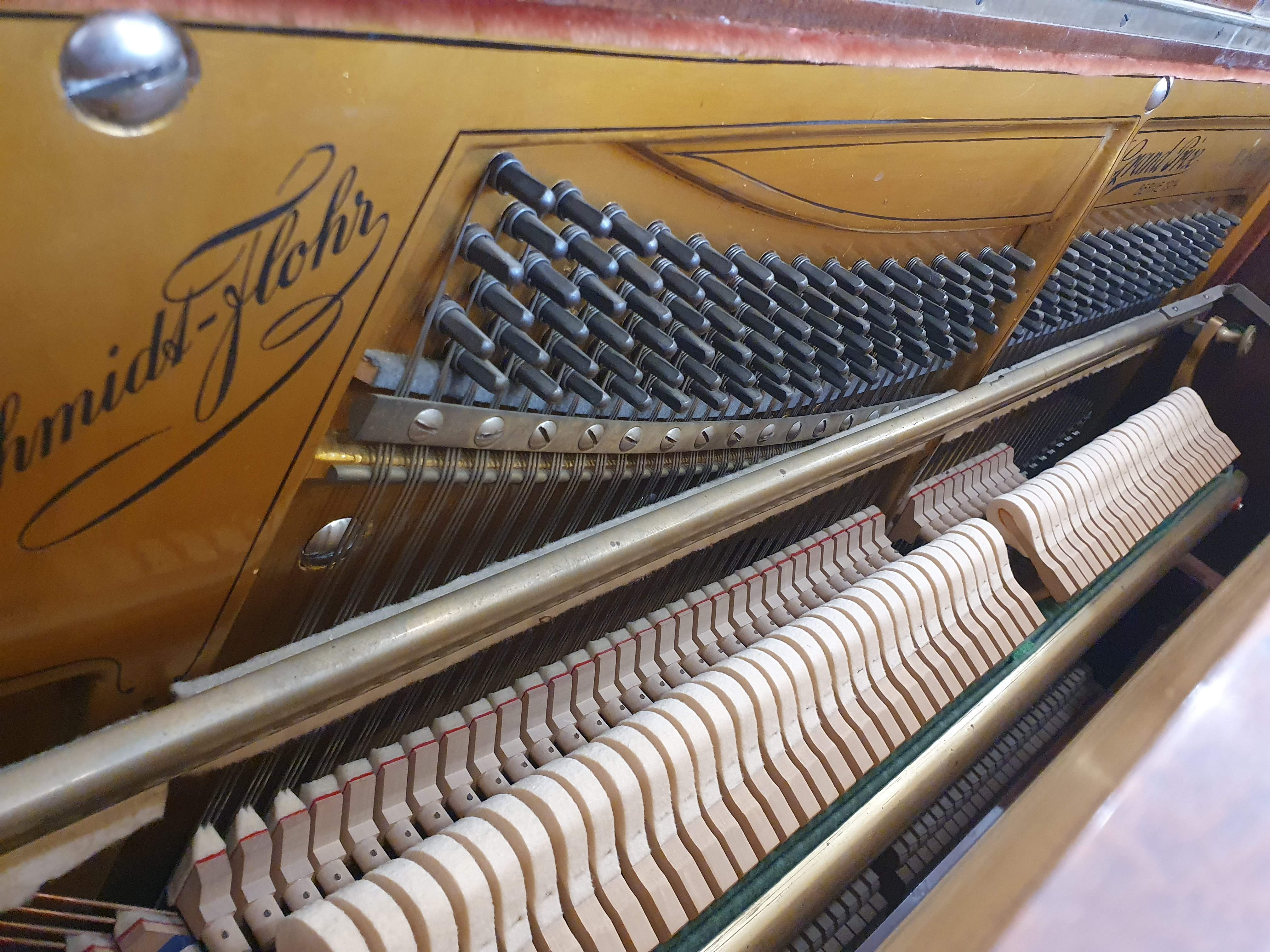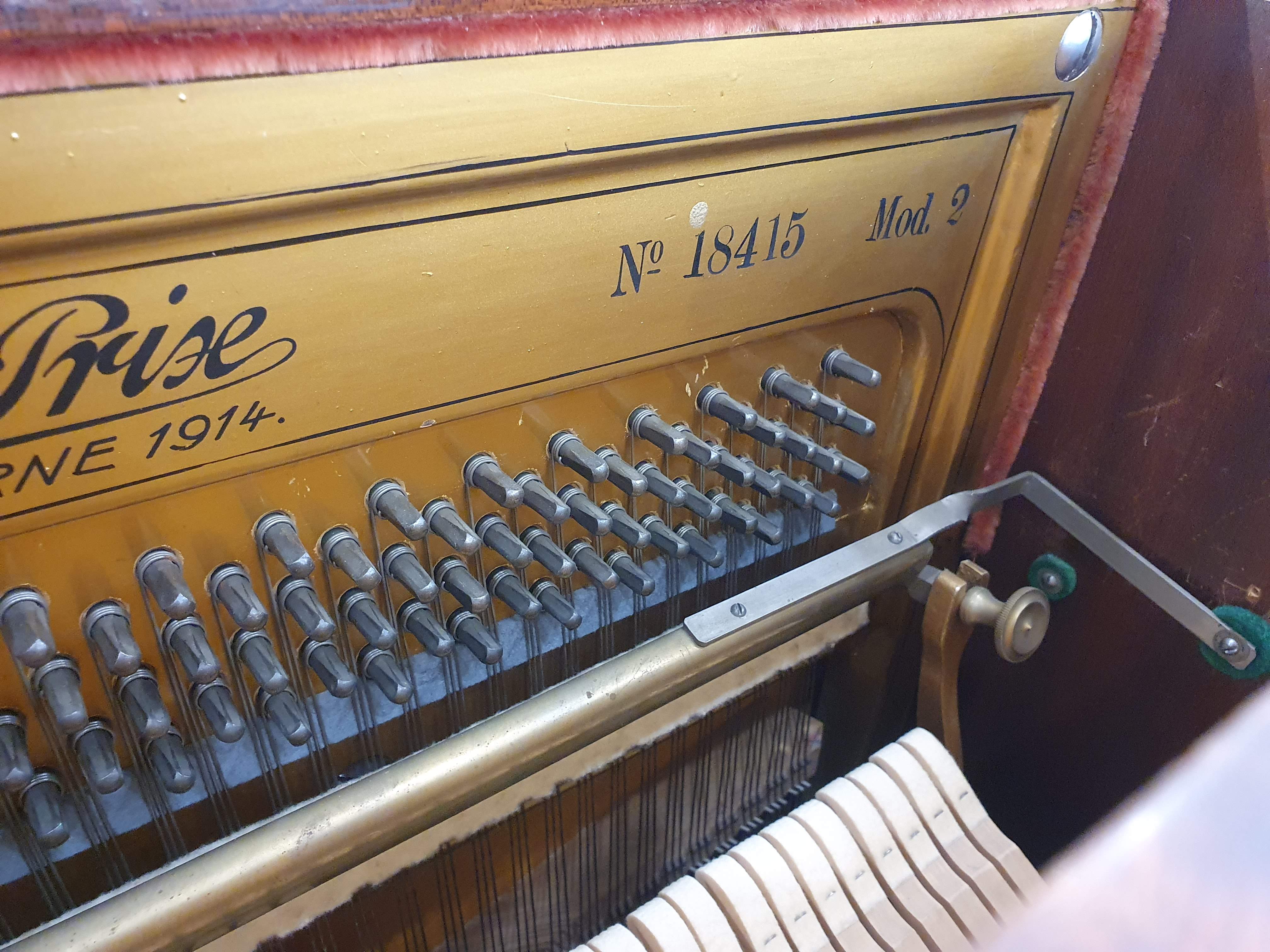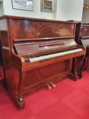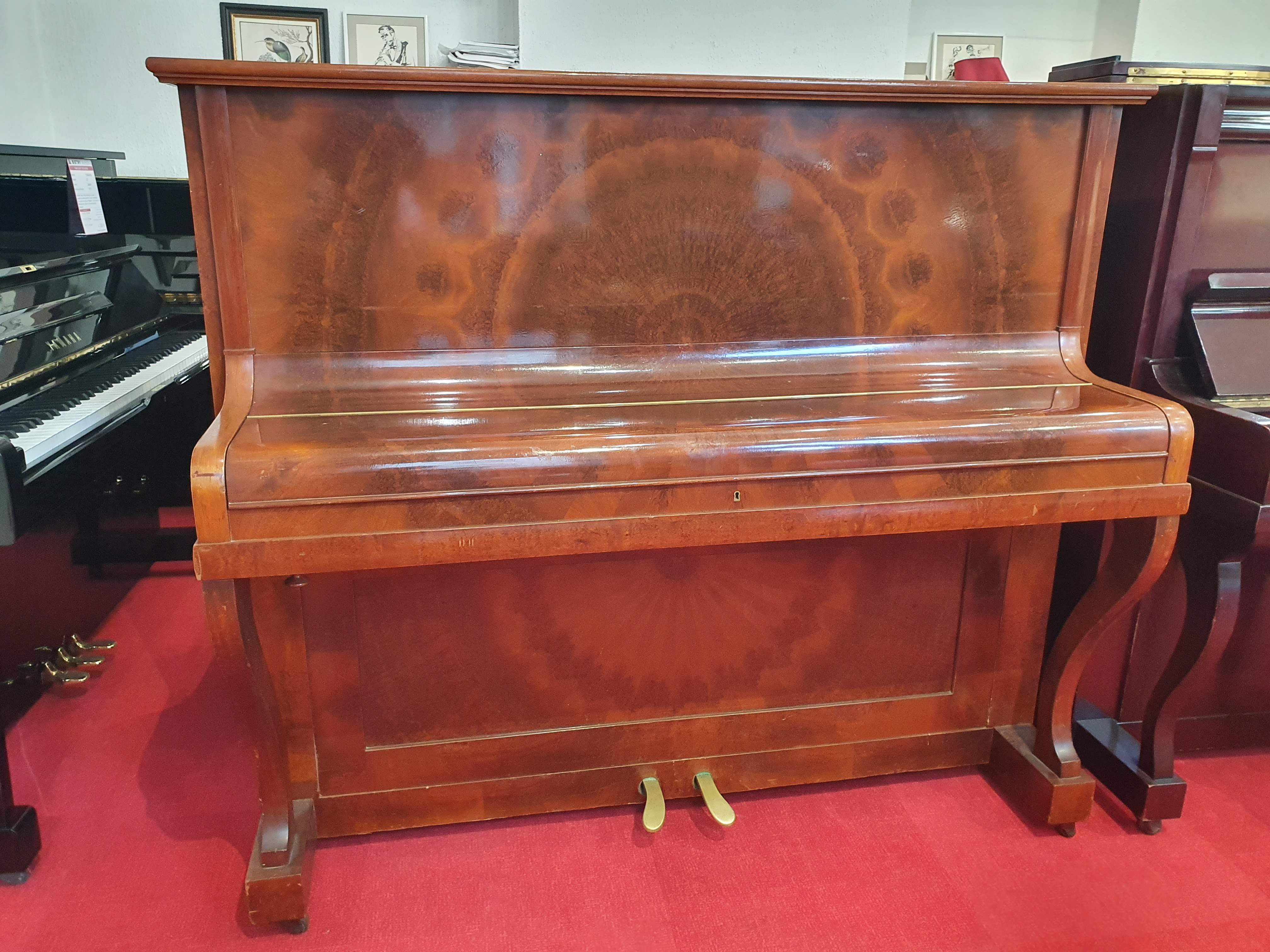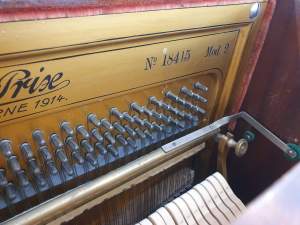 Très beau piano provenant de Suisse. Il est en excellent état. Les têtes de marteaux et les étouffoirs sont impeccables. La taille imposante du meuble permet d'obtenir de généreuses basses ainsi qu'une bonne propagation du son. Il propose un somptueux soleil directement travaillé dans le bois.